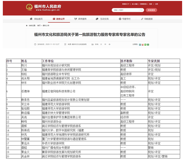 日,福州市人民政府网站发布《福州市文化和旅游局关于第一批旅游智力服务专家库专家名单的公告》,旅游学院宋立中、骆培聪、地理科学学院林岚三位教授入选该专家库。据悉,此次共有旅游行业、研究机构等20人入选,U8·电子(中国)官方网站为入选人数最多的高校。
