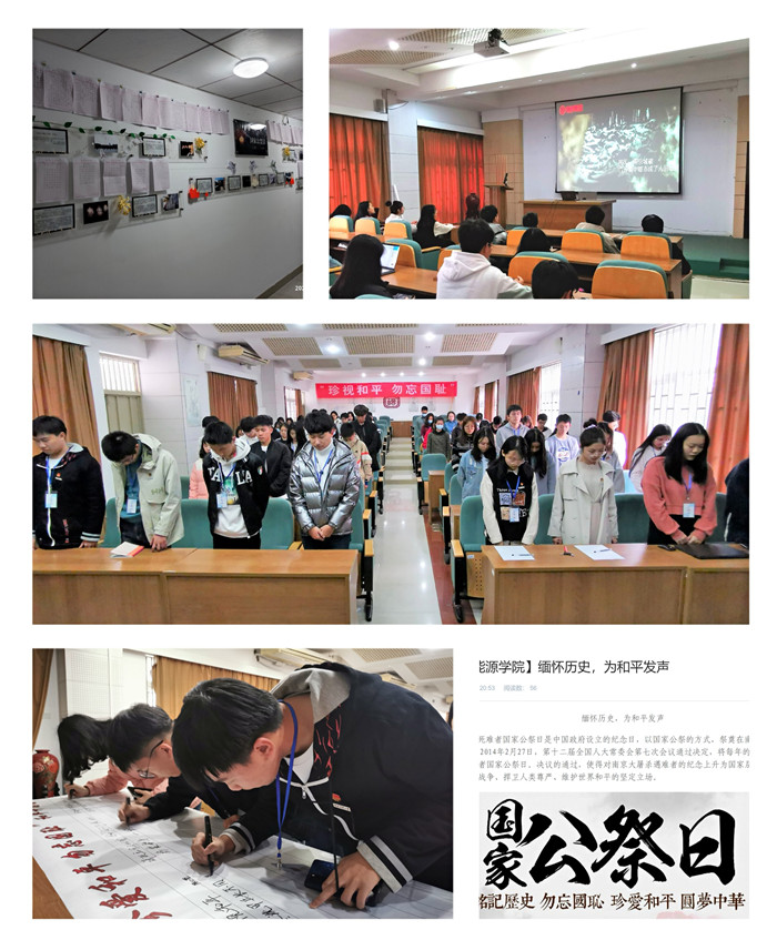 12月13日是第七个南京大屠杀死难者国家公祭日,为铭记历史、祈愿和平,物理与能源学院近日开展“珍视和平 勿忘国耻”国家公祭日主题教育系列活动,悼念死难同胞和先烈,激发爱国情怀,凝聚奋进力量。系列活动包括组织学生观看抗战及公祭日影像资料《国之殇 未敢忘》;书写和平许愿墙和合唱歌曲《没有共产党就没有新中国》;学习公祭读本《血火记忆》并分享学习感受;通过易班平台学习公祭日文章并参与评论;布置国家公祭日主题文化长廊等。(物理与能源学院)