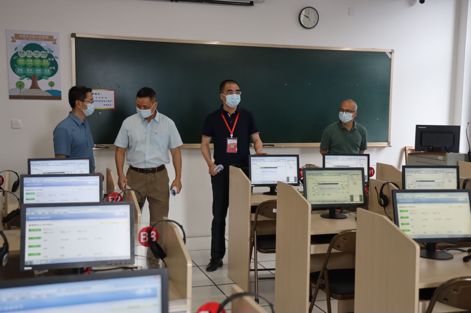 演练结束后,郑家建带领各职能工作组负责人深入综合楼、图书馆和外语学院等5个学科评卷场所进行全面细致的检查,详细了解工作进展情况,并结合应急演练和检查发现的问题对评卷工作进行再动员再部署。他强调,要进一步提高思想认识,增强“备战”意识,落实落细综合协调、现场监督、技术保障、疫情防控、舆情监测等各项举措,切实增强应对复杂局面和应急处置能力;进一步加强精细化管理,优化细化重要环节、关键要点的应急处置措施和流程,确保响应快速有效、处置科学有序;进一步压实各方责任,完善值班值守、联调联控工作机制,确保责任不缺位、环节不掉链、工作不疏漏、处置不耽误,实现安全评卷、健康评卷。