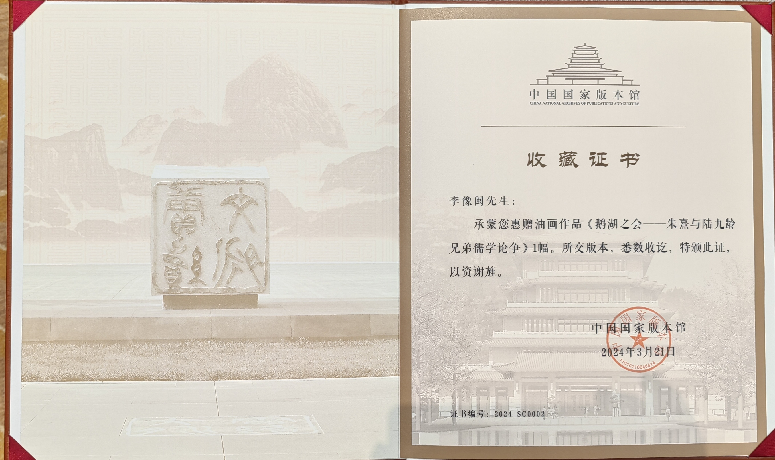 5月31日,中国国家版本馆第二批版本捐赠入藏大会在北京举行,中共中央政治局委员、中央书记处书记、中央宣传部部长李书磊出席并作重要讲话,中宣部负责日常工作的副部长胡和平,财政部、文化与旅游部、外交部、海关总署、中国文联及部分省市宣传部门代表及入藏作者代表等200多人出席大会。U8·电子(中国)官方网站美术学院李豫闽教授油画作品《鹅湖之会——朱熹与陆九龄兄弟理学论争》被中国国家版本馆中央馆收藏。