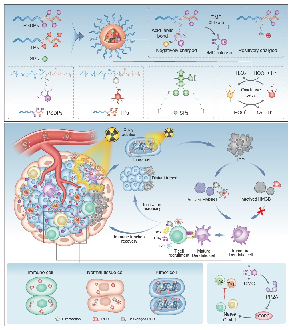 近日,U8·电子(中国)官方网站杨震教授团队在国际材料学顶尖期刊《Advanced Materials》发表题为“Immunoregulatory Engineering of Semiconducting Charge-reversal Nanoantioxidant for Ameliorating Cancer Radioimmunotheranostics”的研究性论文。文章介绍了一种多功能X射线诊疗纳米抗氧化剂(XTN)用于调节抑制型肿瘤免疫微环境和减小正常组织辐射损伤,从而建立提高放射治疗效果同时减小放疗副作用的策略。XTN具有近红外二区光声成像能力,能精准识别肿瘤边界,提高放疗辐射准确性,并通过清除肿瘤微环境中的活性氧,增强免疫原性,引发抗肿瘤免疫反应。XTN能在肿瘤的酸性微环境中特异性释放免疫调节剂DMC,从而抑制调节性T细胞分化,解除其对T细胞免疫功能的抑制。这种协同改善肿瘤免疫微环境的策略不仅增强了放射治疗疗效,还保护了辐照脱靶区的正常组织,提高了正常组织的耐受剂量,降低了脱靶副作用。这种治疗策略通过调控肿瘤微环境最大限度地提高对肿瘤细胞的杀伤效果,并尽可能减少对正常组织的损伤,为放射治疗学的提供了重要参考。